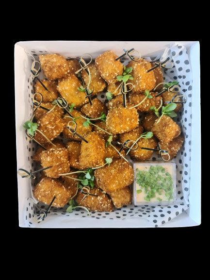 חטיפי סלמון בציפוי פנקו ושומשום  מוגש בתוספת מטבל אסייתי,