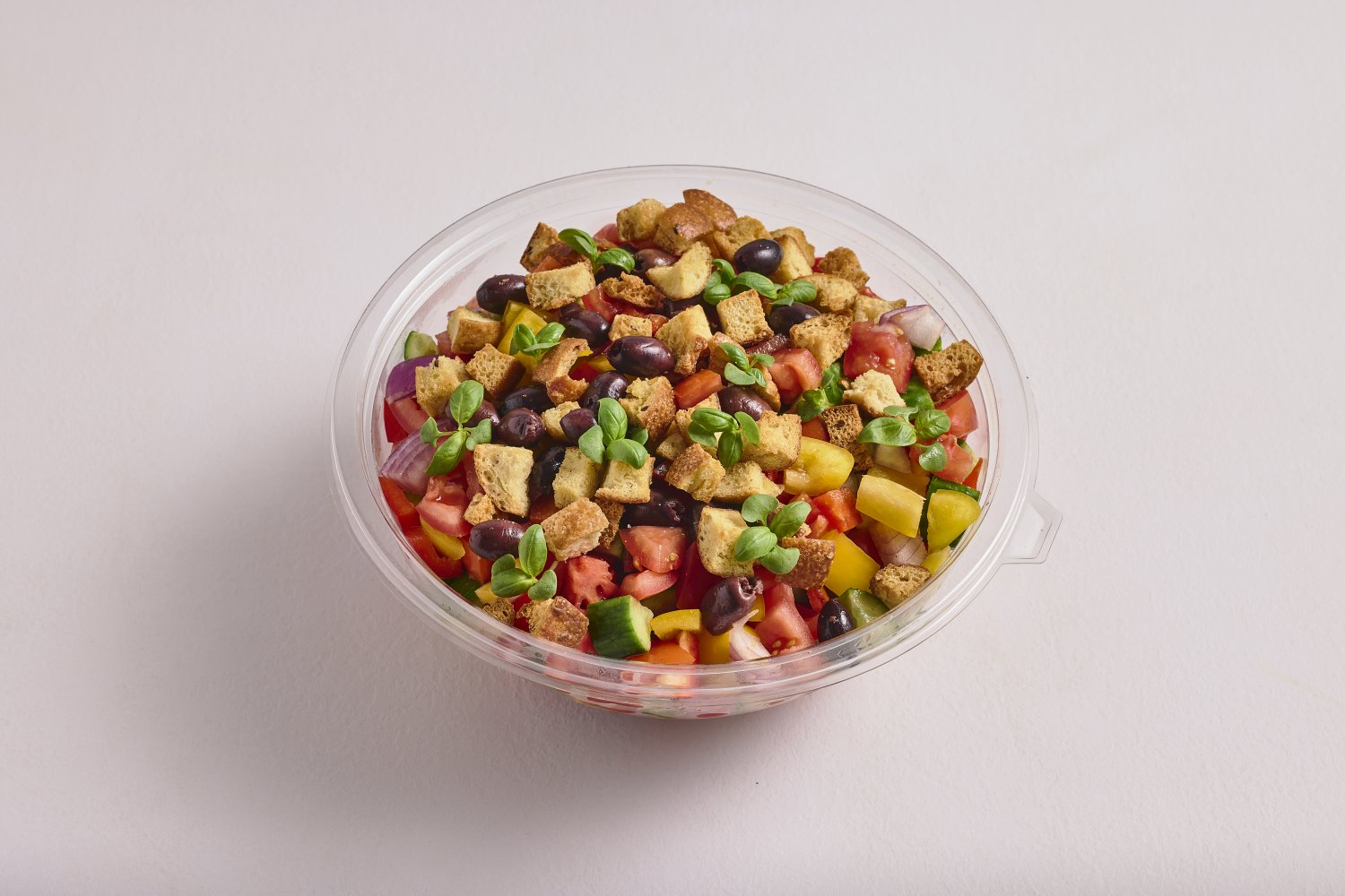 עגבניה, מלפפון, פלפל, בצל סגול, זיתי קלמטה, קרוטונים ועלי בזיל